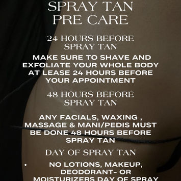 Always exfoliate 24 hours before Spray Tan and do any Pedi, Mani, Facials etc 48 hours before.